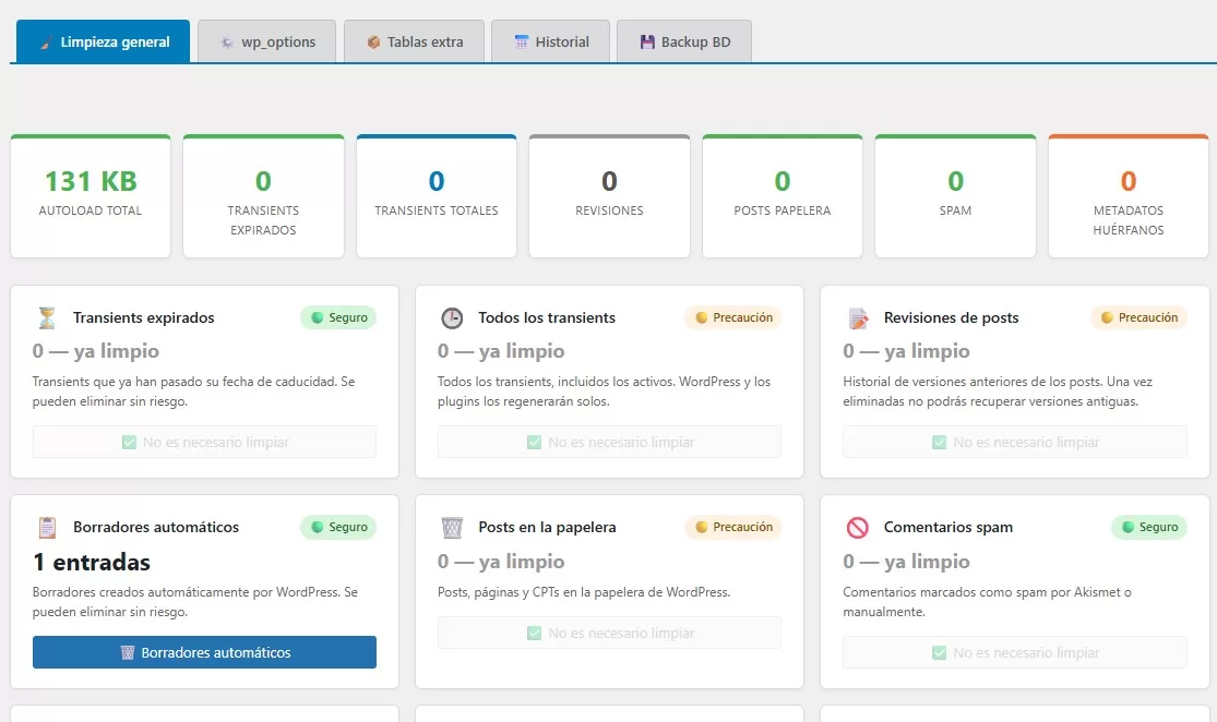 2 – TSO Neteja Options: Limpieza de la base de datos de basura, plugins desinstalados que dejan residuos en la BD, optimización, backup de la BD, y eliminación manual de datos que estan en las tablas diferentes a wp_options de WordPress. Sobre todo, ten cuidado con borrar algo de lo que no estés seguro y haz un backup por si acaso. Idiomas catalán y castellano.